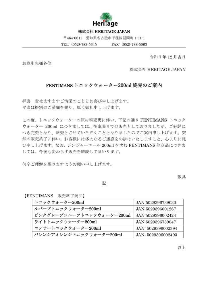 この度、FENTIMANS(フェンティマンス)トニックウォーター200mlにつきましては原材料変更に伴い、在庫限りでの販売としておりましたが、ご好評につき完売となり、終売とさせていただくこととなりましたのでご案内申し上げます。突然の販売終了に伴い、お客様には多大なるご迷惑をお掛けいたしますこと、心よりお詫び申し上げます。
