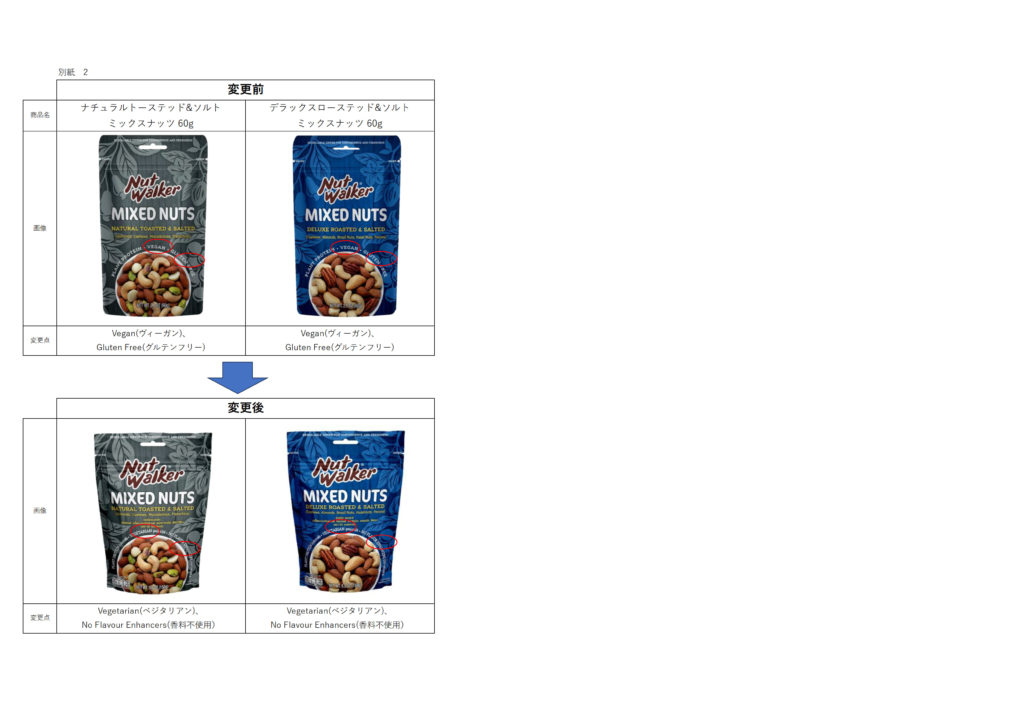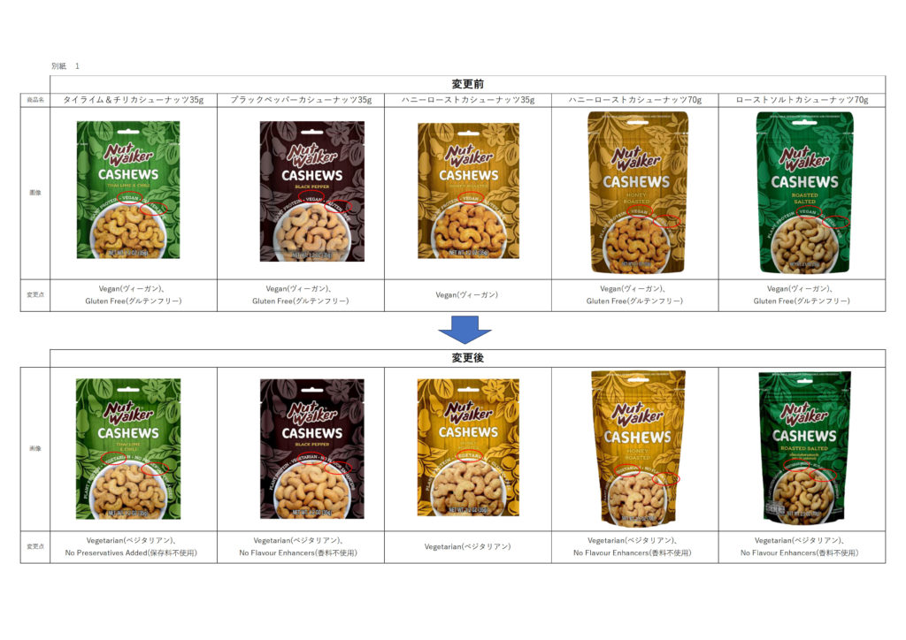長らくご愛顧いただいております弊社取扱商品「ナッツウォーカー」オリジナルシリーズ商品におきまして、「ヴィーガン」並びに「グルテンフリー」に関する国際基準、及び生産国内での表示規則の厳格化に伴い、パッケージデザインの一部文言が変更となりました。