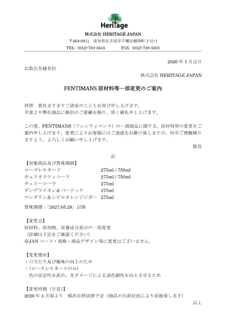2026年1月30日 / 最終更新日時 : 2026年1月30日 HJ投稿 新着情報 フェンティマンス 原材料等一部変更のご案内 Follow me! FacebooktwitterHatenaPocket